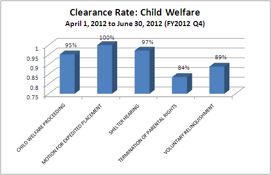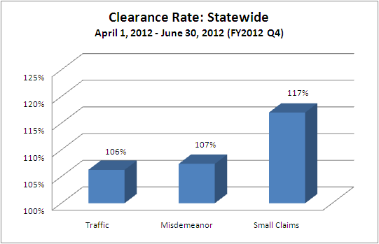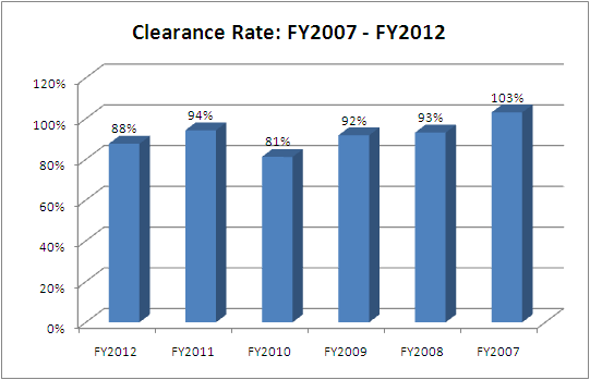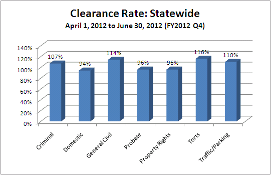 How it is measured: A clearance rate of 100% means the court has disposed of as many cases as were filed in the time period represented. A clearance rate under 100% means the court has disposed of fewer cases than were filed, resulting in an increase in cases awaiting disposition. A clearance rate over 100% means the court has disposed of more cases than were filed, resulting in a decrease in cases awaiting disposition.