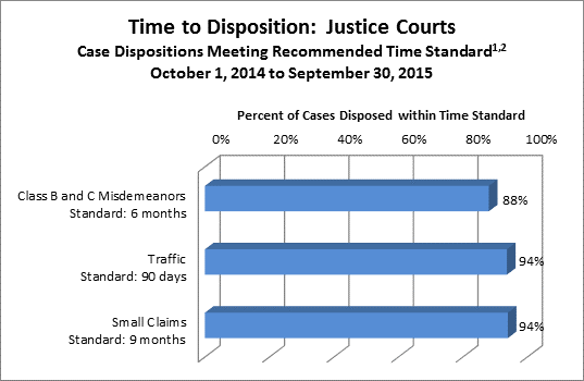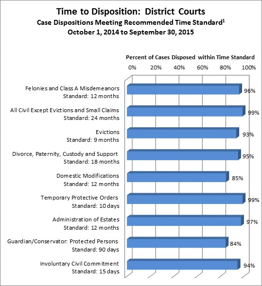 What it is: In January 2013, the Utah Judicial Council adopted time to disposition guidelines suggesting 95% of case dispositions meet the established time goal. Time to Disposition is the courts' assessment of how long it should take to resolve each case type.