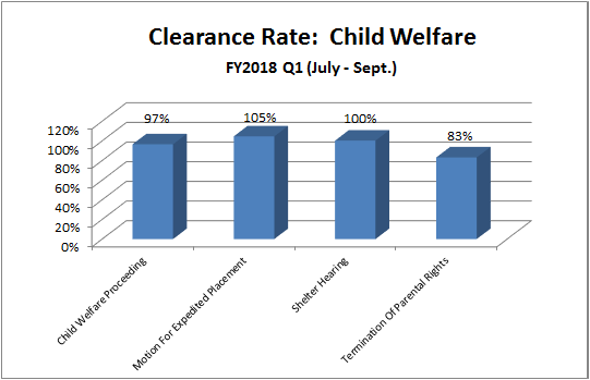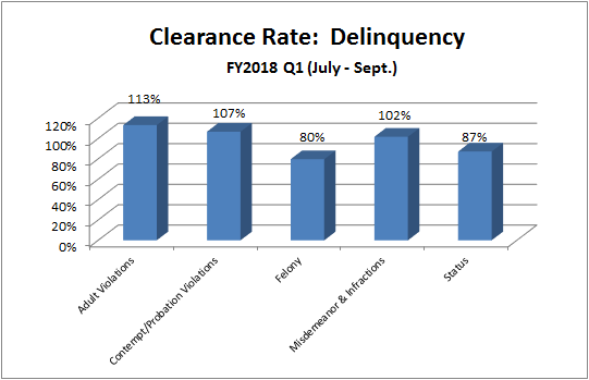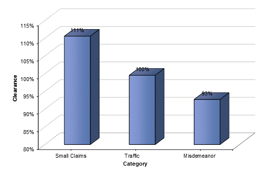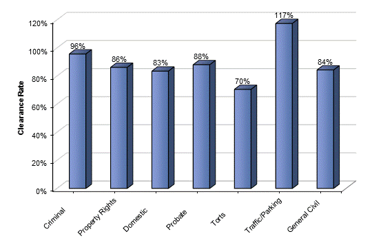 How it is measured: A clearance rate of 100% means the court has disposed of as many cases as were filed in the time period represented. A clearance rate under 100% means the court has disposed of fewer cases than were filed, resulting in an increase in cases awaiting disposition. A clearance rate over 100% means the court has disposed of more cases than were filed, resulting in a decrease in cases awaiting disposition.