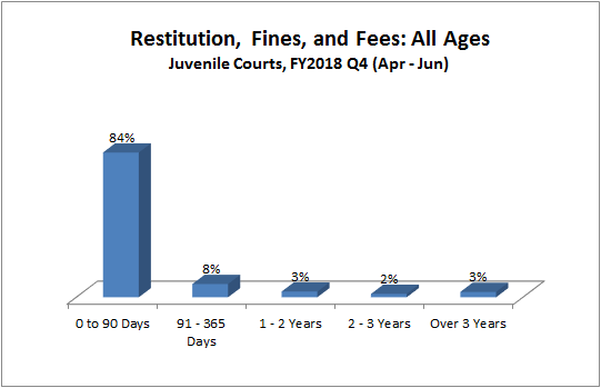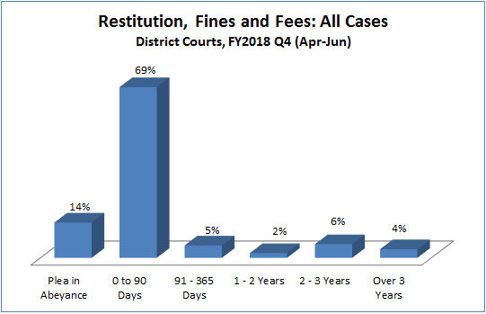 What it is: The amount of outstanding restitution owed to victims and uncollected court-ordered fines and fees. The graphs below are given to show how long court-ordered restitution, fines, and fees have been outstanding. Column percentages represent the proportion of all money owed based on when the court mandate was given. For example, a value of 5% in the "Over 3 years" column signifies that 5% of all the money owed to the court was ordered more than 3 years ago. A plea in abeyance is available in criminal cases in district court and does not apply to juvenile court cases.