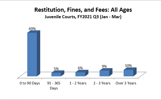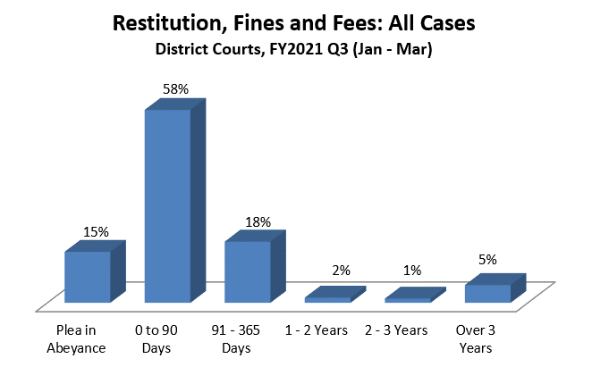 What it is: The amount of outstanding restitution owed to victims and uncollected court-ordered fines and fees. The graphs below are given to show how long court-ordered restitution, fines, and fees have been outstanding. Column percentages represent the proportion of all money owed based on when the court mandate was given. For example, a value of 5% in the "Over 3 years" column signifies that 5% of all the money owed to the court was ordered more than 3 years ago. A plea in abeyance is available in criminal cases in district court and does not apply to juvenile court cases.
